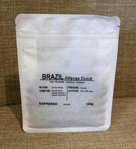 These espresso beans were grown in the Sul de Minas region, consisting of Mundo Novo. Catuai Amarelo and Catuai Vermelho varieties. They have notes of Dark chocolate, hazelnut and caramel. Yum!